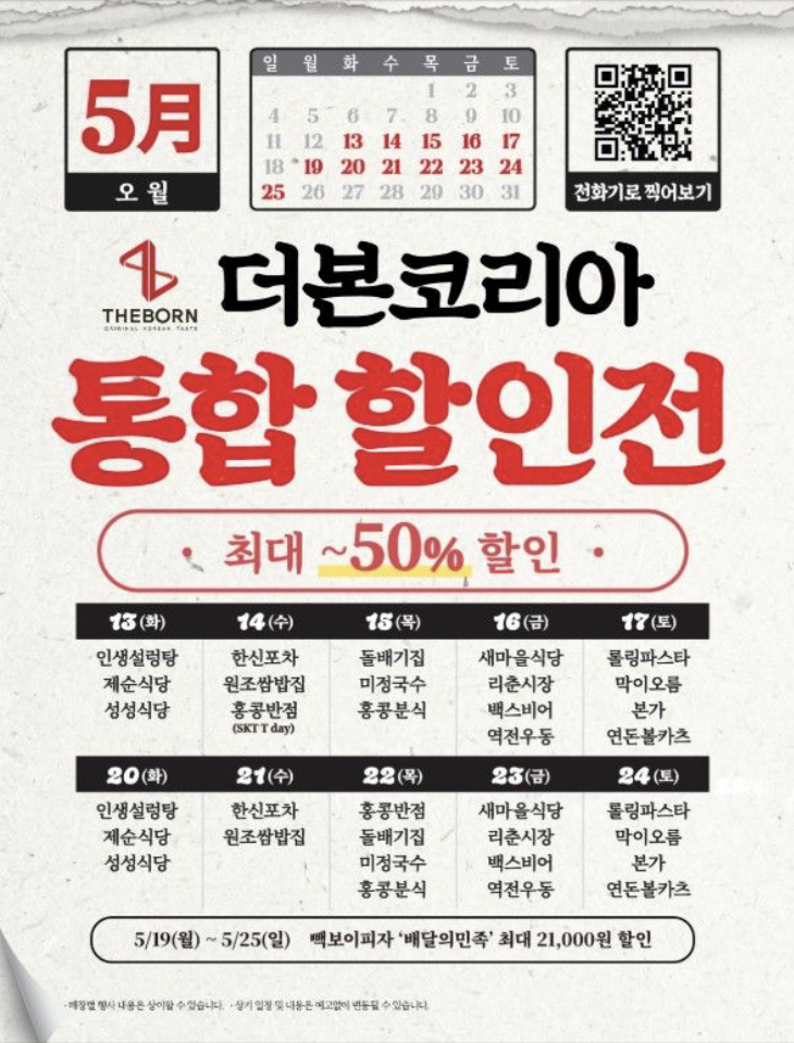 이번 더본코리아 '반값 할인' 통합전은 2025년 5월 13일(화)부터 5월 25일(일)까지 약 2주간 진행됩니다. 그럼, 주요 참여 브랜드와 할인 메뉴, 그리고 할인 혜택을 자세히 아래에서 살펴볼까요?